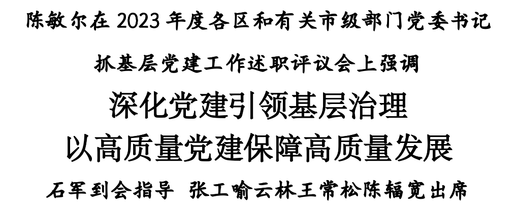 陈敏尔指出,开展党委书记抓基层党建工作述职评议,是落实全面从严治党要求、履行管党治党政治责任的重要制度安排,这次会议是在学习贯彻习近平新时代中国特色社会主义思想主题教育即将收官之际召开的,是巩固拓展主题教育成果、全面加强我市基层党建工作的具体举措。一年来,全市各级党组织扎实开展主题教育,着力以高质量党建保障高质量发展,推进了一些大事难事,经历了一些大战大考,基层党建工作得到有效检验,各领域党的领导和党的建设进一步加强,广大党员干部在关键时刻展现出良好状态、练就了过硬本领。要坚持目标导向、问题导向、结果导向,认真查找在履行主体责任、抓党建促发展、基层党组织建设等方面存在的不足,工作上的差距从学习认识上找原因,基层的问题从根子上找原因,普遍存在的问题从制度上找原因,对症下药,有的放矢,补短板,强弱项,不断提高我市基层党建工作水平。